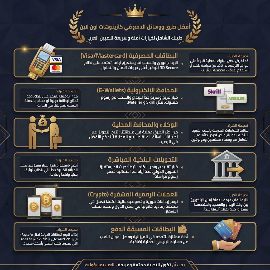 أتحقق أولا من توافر وسائل شائعة في الدولة مثل بطاقات Visa وMastercard الصادرة من البنوك الإماراتية، والمحافظ الإلكترونية العالمية مثل Skrill وNeteller وecoPayz، إلى جانب خدمات الدفع الرقمية مثل Apple Pay وGoogle Pay، وخيارات العملات الرقمية مثل Bitcoin وUSDT التي انتشرت بشكل لافت بين اللاعبين في الإمارات.